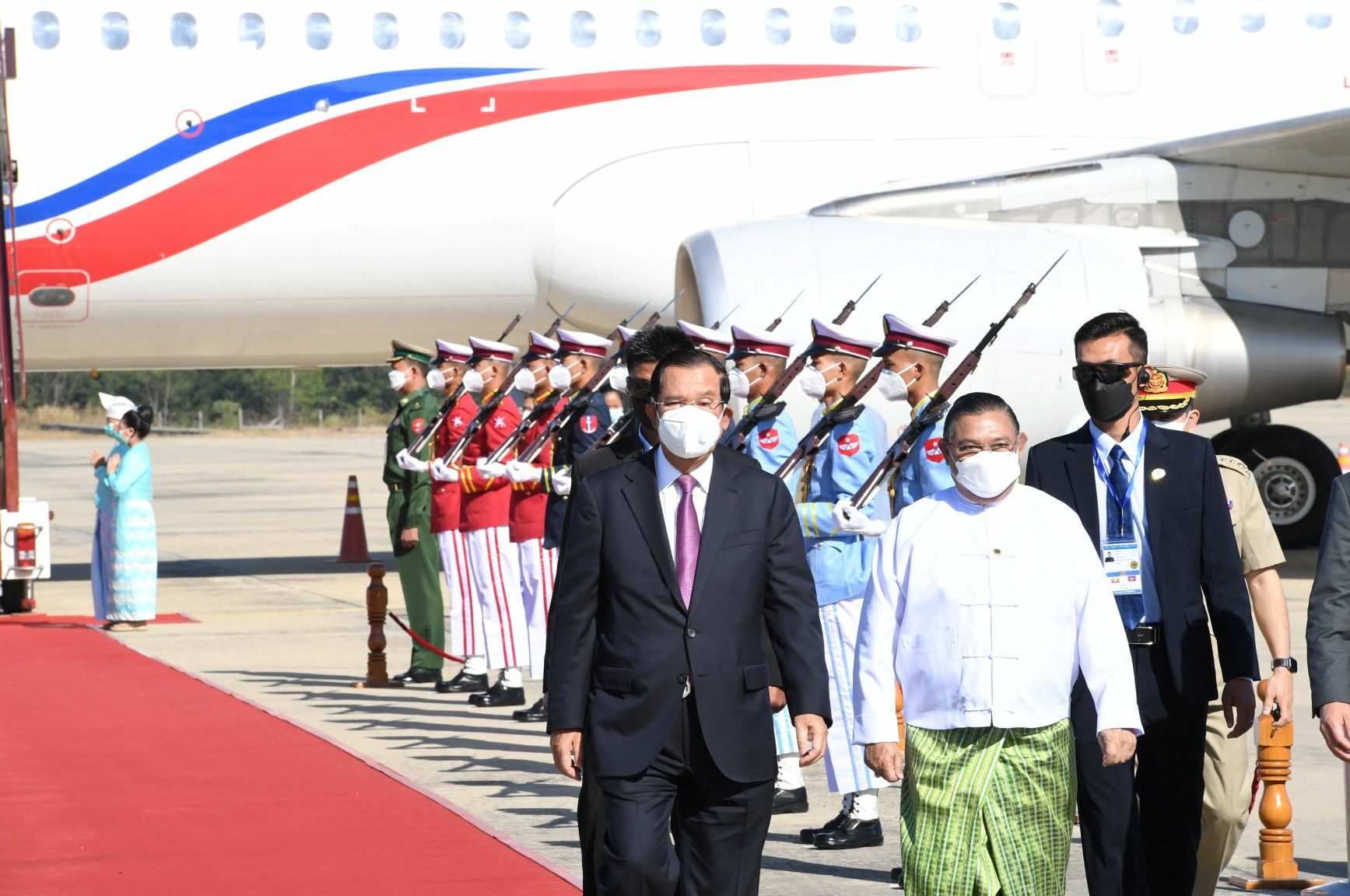 HH Hun Sen received a warm welcome from the Myanmar military government. who sent Foreign Minister Phana Maung Lwin to welcome him with a guard of honor at Nay Pyi Taw Airport